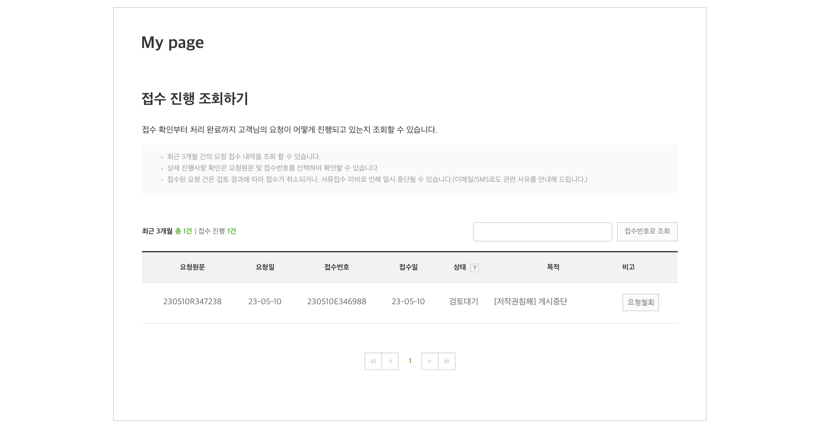접수완료가 되고 진행 상황도 조회할 수 있다.