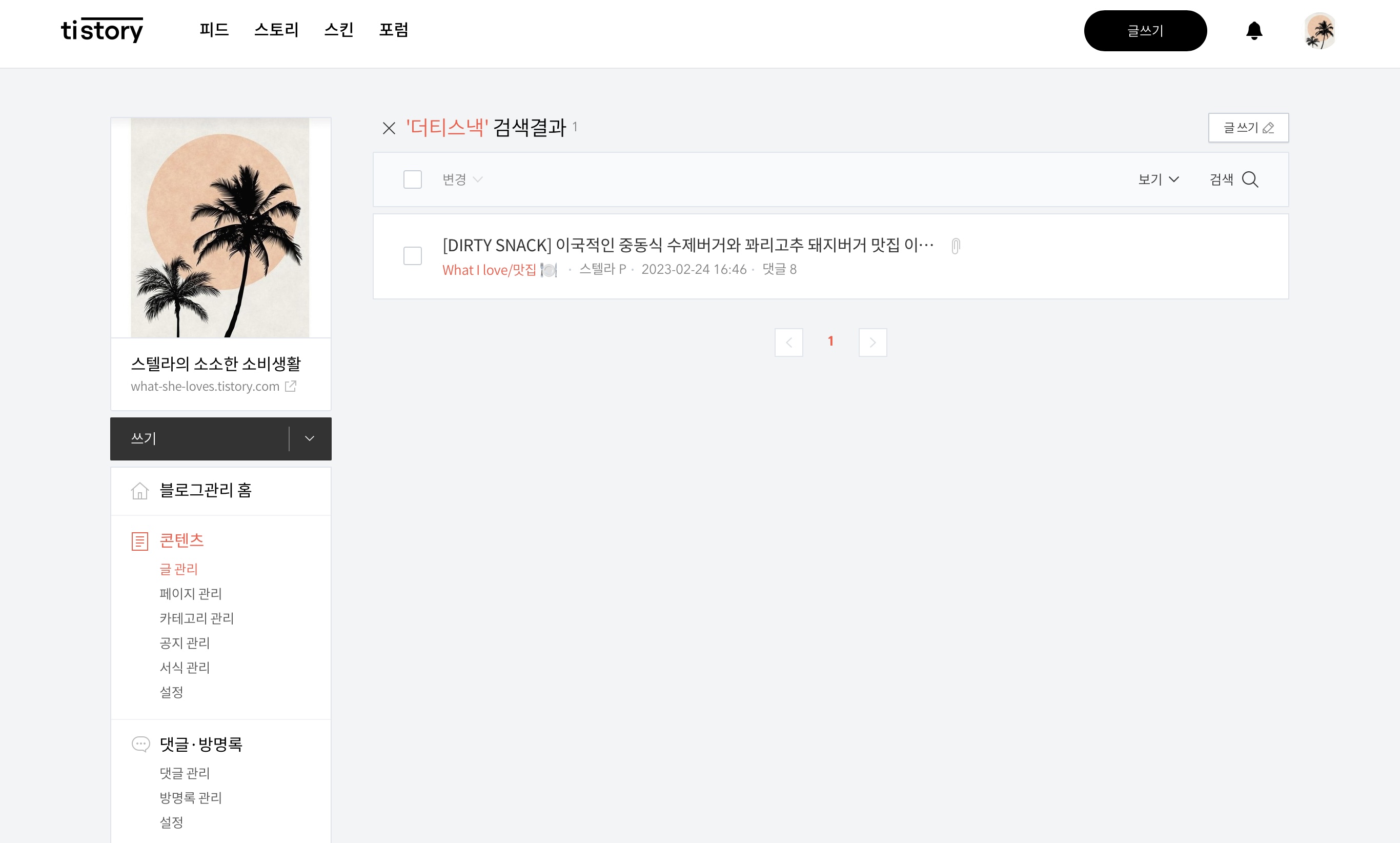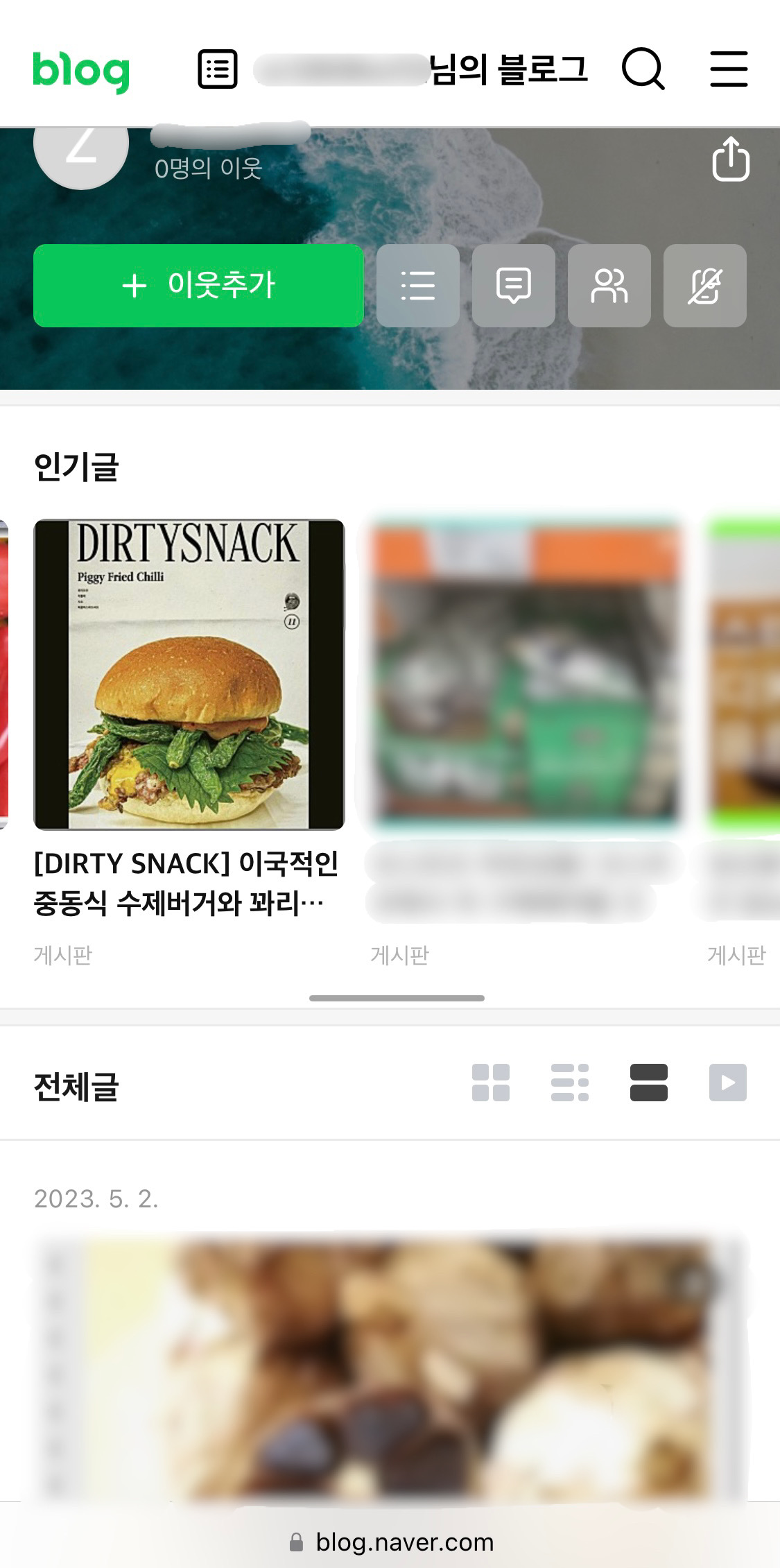키워드를 눌러 네이버에서 더티스낵으로 검색했을 때 내 글이 잘 노출되고 있나 찾아보는데 제목이랑 사진만 보고 내 글인 줄 알고 눌렀는데, 잉? 뭐지? 티스토리가 아니라 네이버 블로그에 내가 쓴 더티스낵 글의 제목과 똑같은 제목이 있었다.