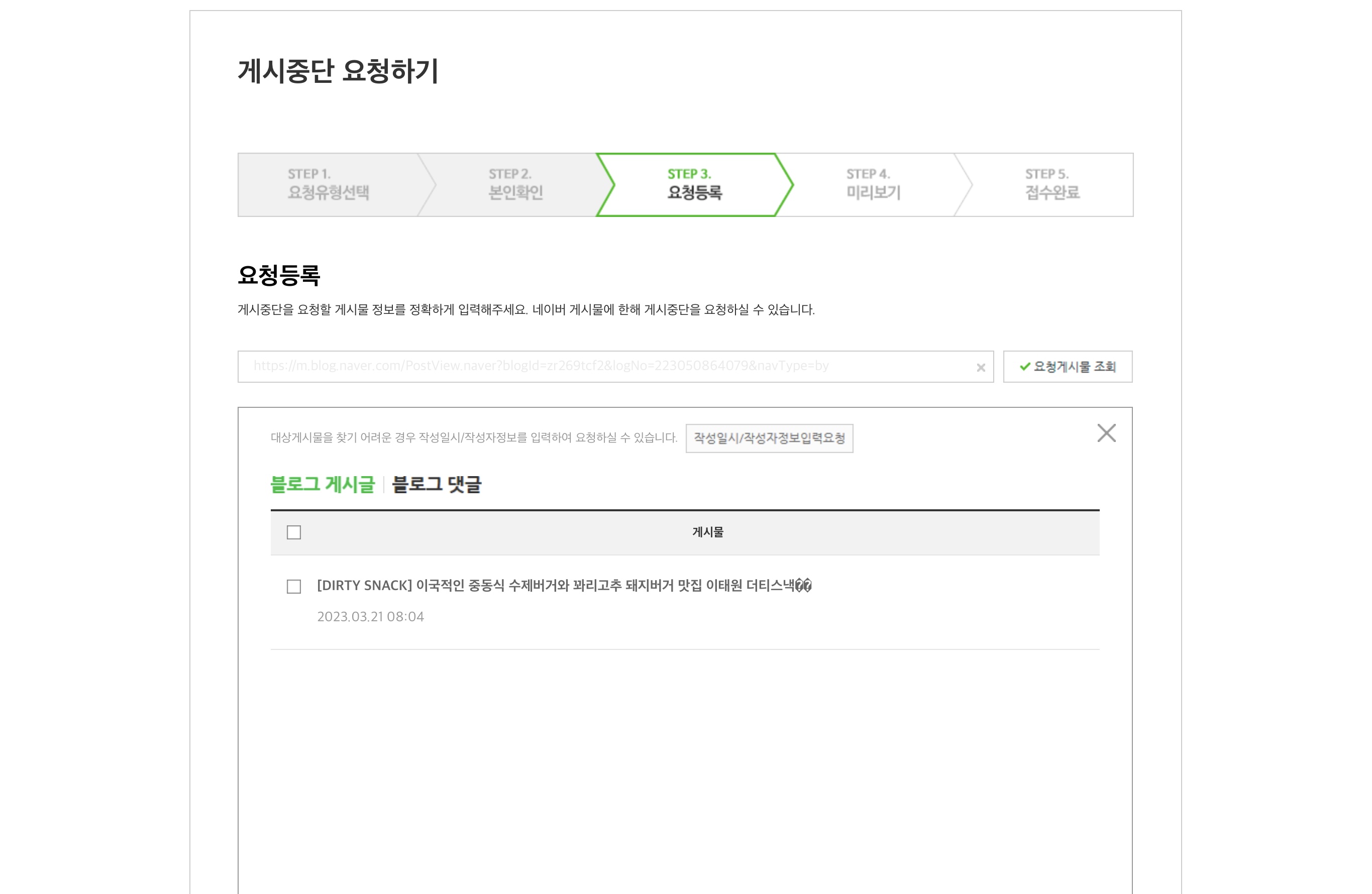 이제 나쁜놈의 블로그 게시물 URL 주소를 입력하고 요청게시물 조회를 클릭하면 된다.